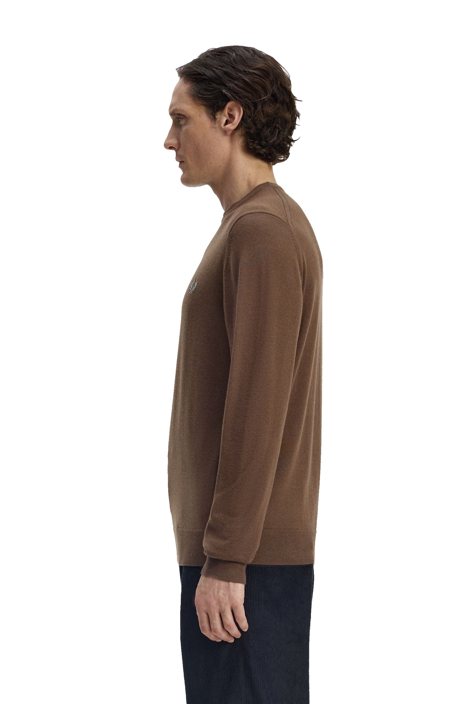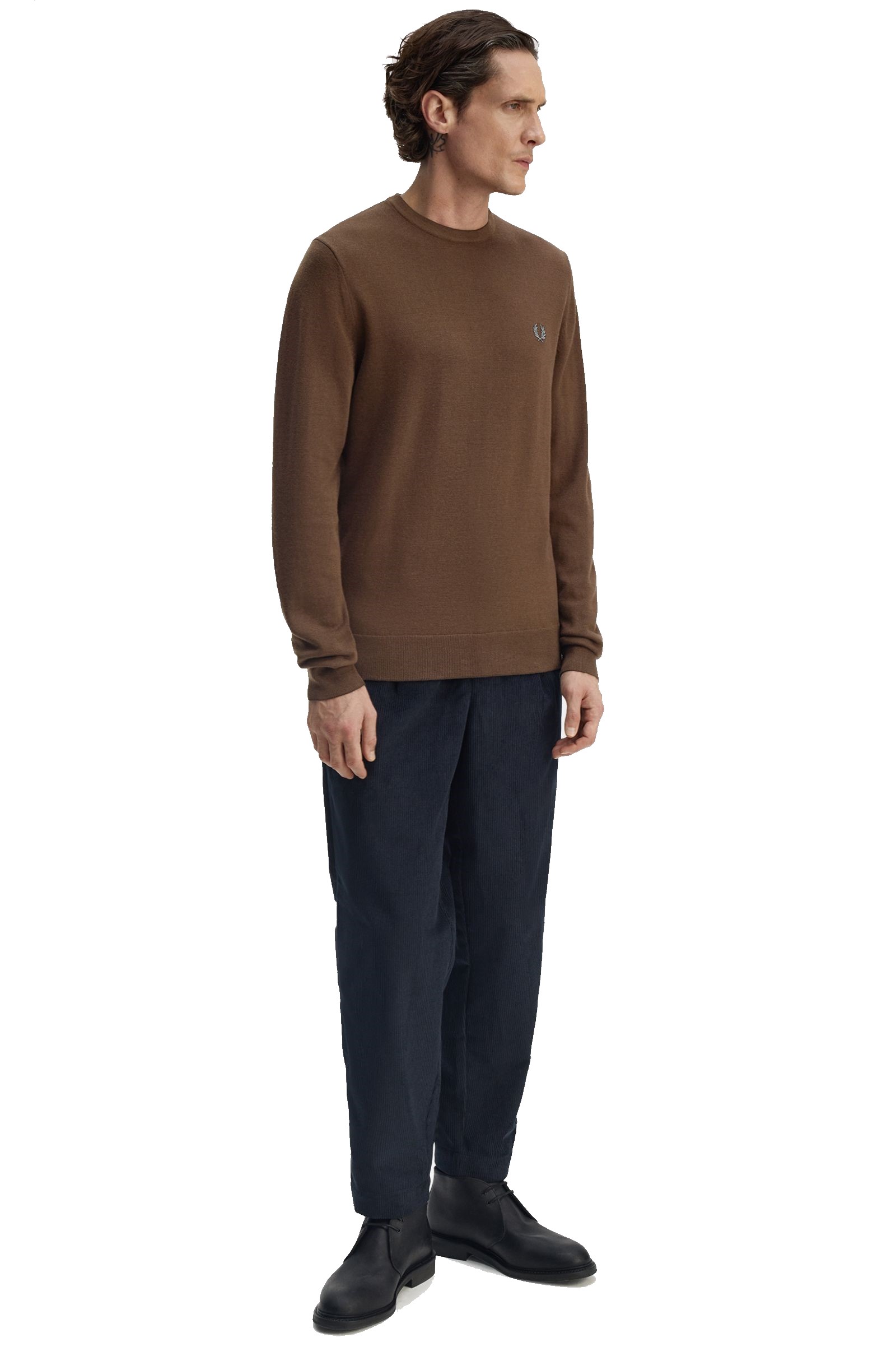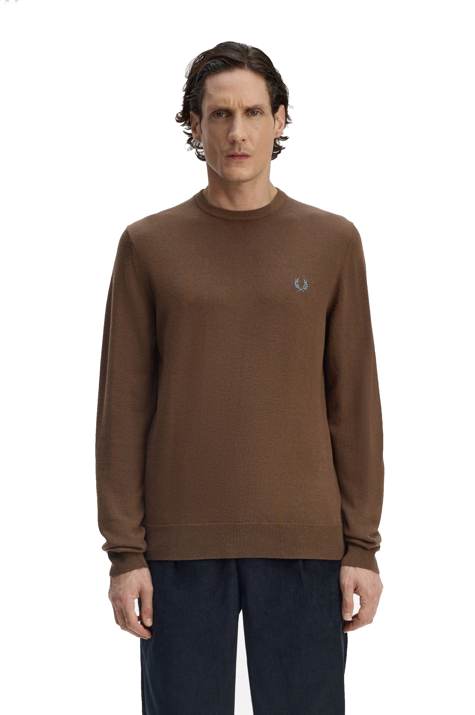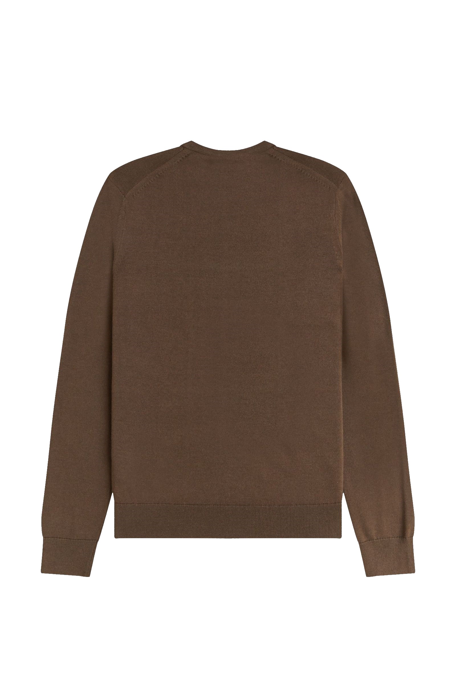 Un jersey de cuello redondo clásico tejido en una mezcla de lana merina y algodón. Diseñado con los colores clásicos de Fred Perry y un ribete con dos franjas en la parte interior del cuello.