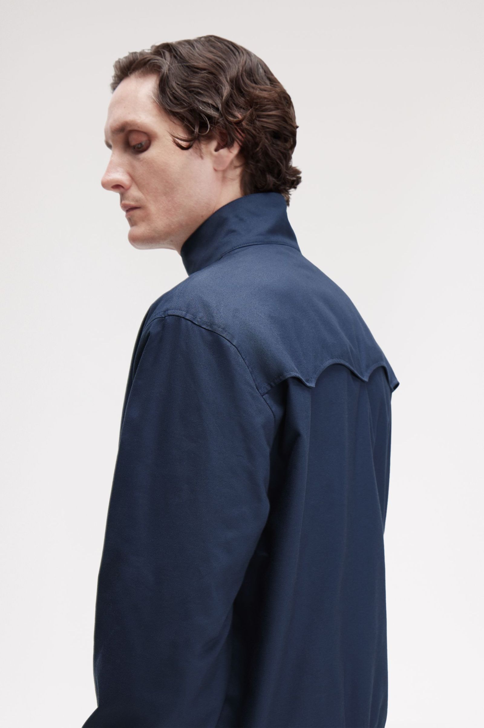 Nuestra clásica chaqueta Harrington, esta vez, con canesú tipo paraguas y forro de color liso. La chaqueta Harrington se diseñó por primera vez en Gran Bretaña en los años 30, pero fueron los mods de los años 60 quienes le dieron la popularidad que tiene hoy en día. En combinación con el polo Fred Perry, se convirtió en una parte esencial de la indumentaria de aspecto duro y resistente. Unos cuantos detalles le dan un toque renovado: el canesú tipo paraguas aporta mayor resistencia, el clásico forro de tartán brillante se sustituye por un interior liso y más sobrio, y el exterior enmarca el diseño con un intenso tono azul tenis, el mismo que el de las etiquetas de los diseños de archivo de nuestro catálogo de los años 70.