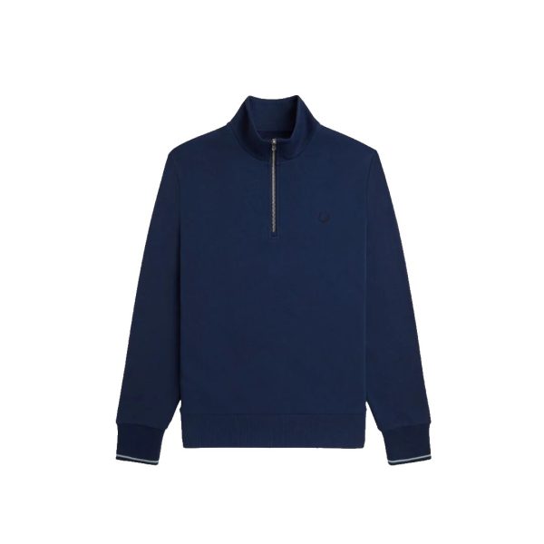 Nuestro modelo de algodón con media cremallera y el ribete con dos franjas en los puños. Nuestra sudadera con media cremallera, un modelo a medio camino entre la ropa deportiva y la moda urbana, es una prenda básica y versátil, caracterizada por su sencillo diseño minimalista. Este modelo incluye, además, nuestra inconfundible corona de laurel bordada, unos puños con el ribete de dos franjas y un clásico y elegante cuello de chimenea.
