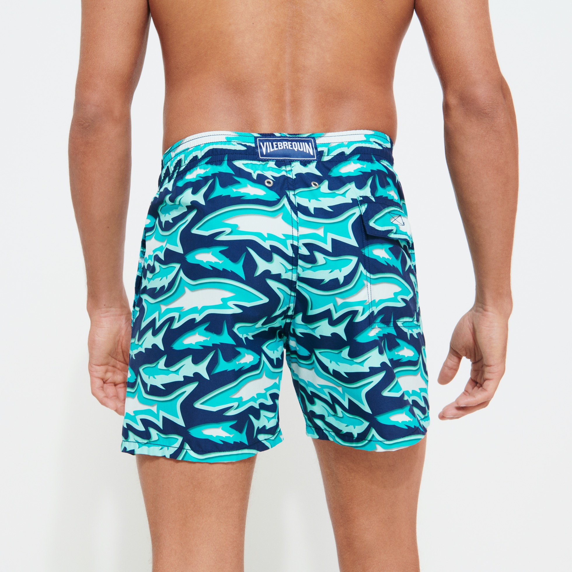 Haz que tus baños sean más divertidos con los graciosos tiburones de este bañador Moorea con estampado Requins 3D para hombre. Este estampado exclusivo aporta un nuevo look a este bañador de tres bolsillos con cinturilla elástica con cordón de ajuste, inspirado en el emblemático modelo de Vilebrequin de los 70.